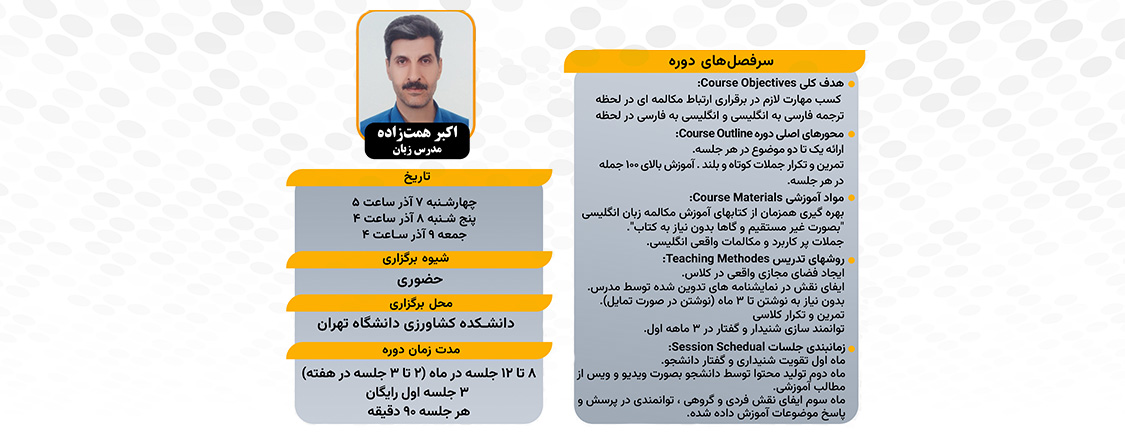 مکالمه انگلیسی در لحظه و کاربردی   مدرس دوره : جناب آقای اکبر همت زاده هزینه ثبت نام :  سه جلسه اول رایگان   تاریخ ...